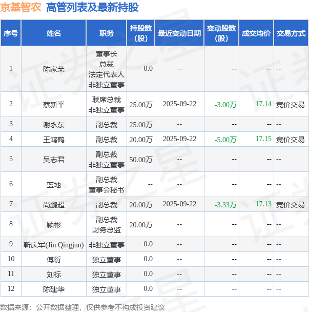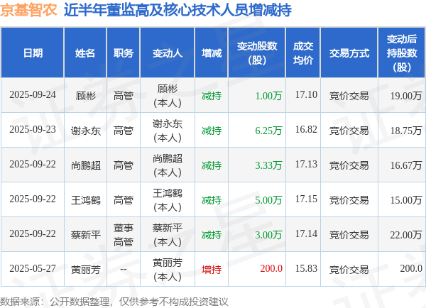 京基智农近半年内的董监高及核心技术人员增减持详情如下: